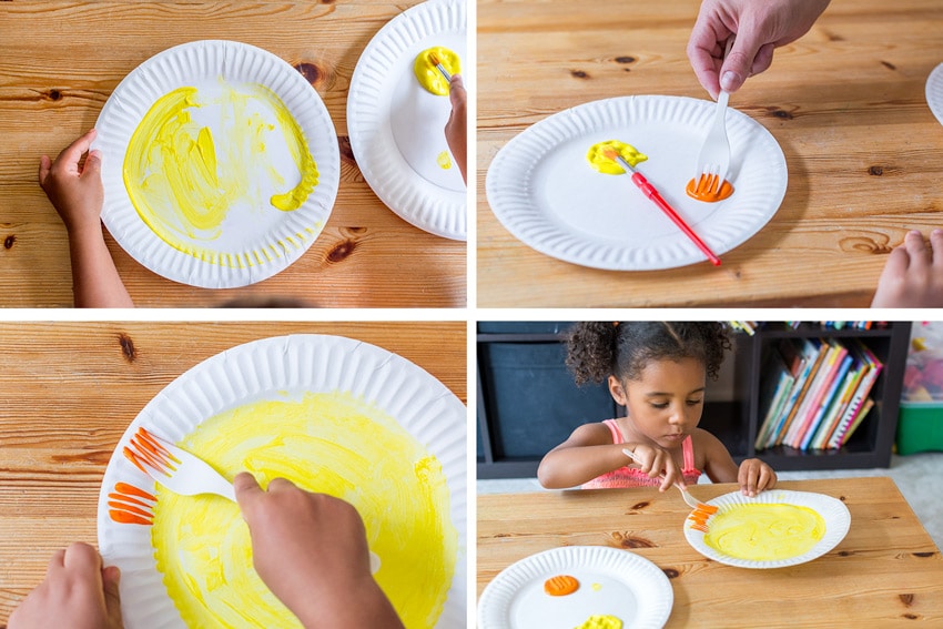 To make this simple lion craft using paper plates, you only need four things — washable paint, paint brushes, forks, and paper plates. I used an extra plate to add little dollops of paint that my kids could use to paint their lions. I also made one for them so they could copy mine.