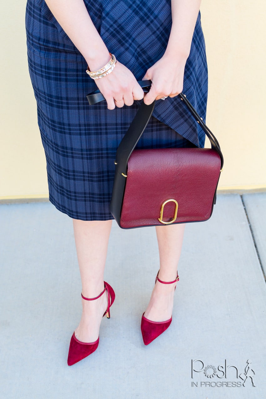 {Stacey’s Look: Banana Republic Dress; WHBM Shoes (c/o) (similar); 3.1 Philip Lim Handbag; Banana Republic Bracelet; Smith and Cult Lip Color}