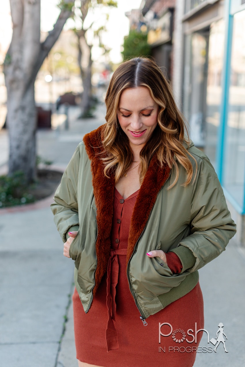 For my second look, I went much more casual with a bomber jacket with faux fur lining and my favorite studded flats. I wanted to keep the look a lot more casual because I wanted to show you how to style sweater dresses in two very different ways. Personally, I prefer to wear a heel with sweater dresses because I think it makes my legs look better. The flats are a bit more frumpy. I often do wear white sneakers, like these, with sweater dresses too. Sneakers or flats definiteliy makes it easier to wear sweater dresses on the weekends. I can run errands or play with my kids when I’m wearing ultra comfortable shoes.