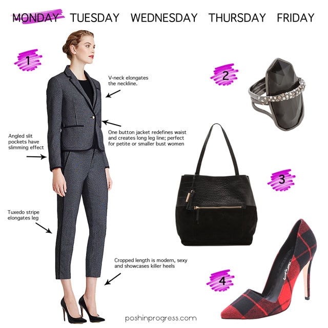 Start the work week off with a modern take on a traditional tuxedo with (1) 424 Fifth Lord & Taylor piped suit. An edgy (2) ring and classically shaped suede and leather (3) handbag compliments the outfit. The black tuxedo stripe instantly elongates the leg line and the jacket lapel in the shape of a v draws the eye toward the face. The single button just below the chest accentuates a tiny waist. The flat front pants with the side slit pockets create a slimming illusion. The cropped length is modern and a bit sexy, while showcasing interesting shoes, like the statement-making (4) tartan heels.