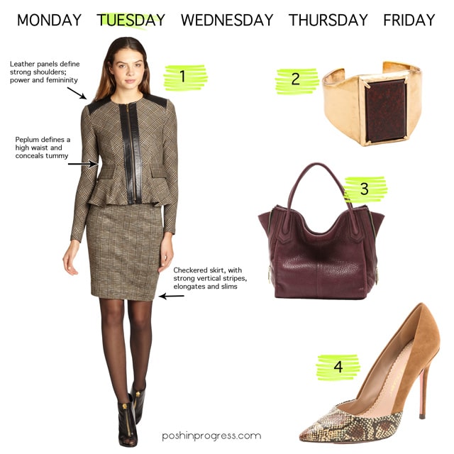 I tend to avoid black suits because the color often seems stark on my olive skin. This (1) Nanette Lepore tweed suit in brown tweed would be flattering on most skin tones. Its leather accents define a shoulder and give a modern edge to a classic print and textile. The subtle peplum is modern while defining a waist and at the same time camouflaging many women’s problem area (little tummy). This (2) cuff bracelet mimics the gold in the zipper and adds subtle bling. Although nearly any handbag color would work with this suit, I like this (3) eggplant satchel, as burgundy handbags are so versatile and perfect for a fall and winter wardrobe. Finally, a (4) snakeskin and suede pump will elongate the leg line while adding some drama to the look.