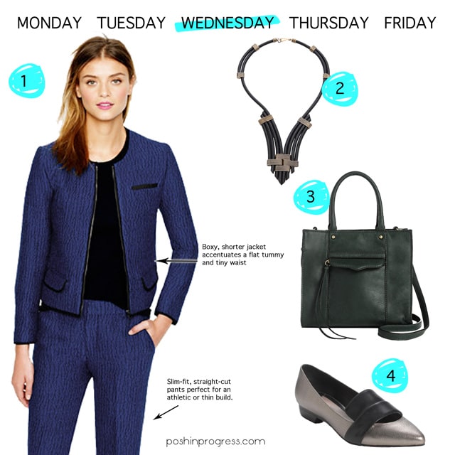 The cropped length of the pants should be showcased with an interesting shoe. I like these (4) flat loafers for a nontraditional take on a work shoe. This suit would also look great with stiletto pumps, but the loafers are much more unexpected and cool.
