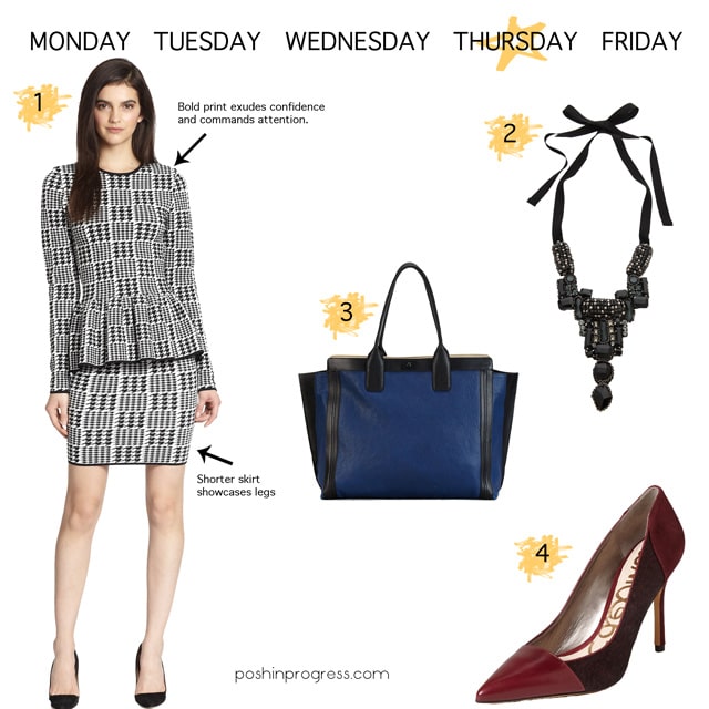 If you are print averse, I dare you to try one. Black and white is a great place to start, with this (1) Torn Houndstooth peplum suit. A print like this screams confidence and it is modern, yet girly with a more exaggerated peplum. Since this suit has a full-length sleeve and high neckline, going a tad bit shorter on the skirt works to showcase lean legs and adds just a touch of sexiness to this outfit. To break up the print, I like this adjustable length (2) necklace to add subtle dimension to the outfit. A black and white suit lends itself to almost any color bag and shoes, but I opted for more muted colors with this black and blue (3) satchel and (4) burgundy pumps to keep the suit the star (and no, you don’t need to match your handbag and shoes!).