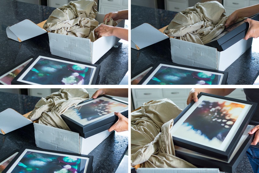 Just like with wardrobe boxes, I hardly ever buy picture frame boxes. They are also expensive and not that effective. I prefer to use medium boxes and bedding in between the pictures to protect them. Just like with dishes, I wrap blankets, sheets, and pillow cases around the pictures and stack them on top of each other. I didn’t break any pictures on this move either.
