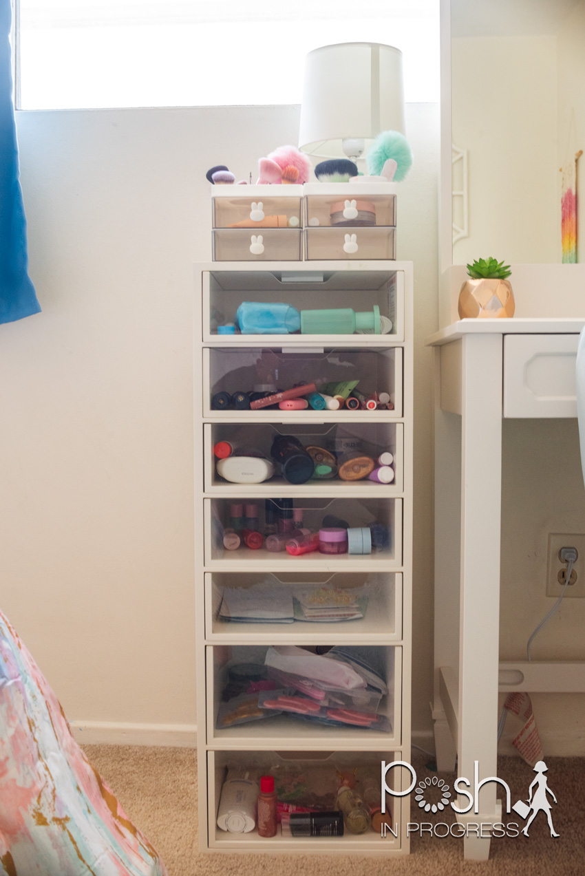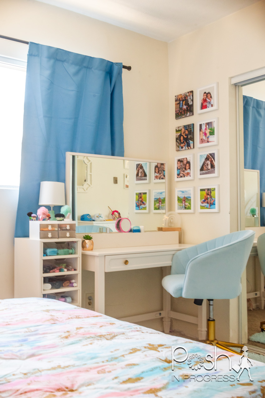 We focused on versatile furniture pieces from Pottery Barn Teen that would grow with her. The gorgeous white dresser and matching nightstand are stand-out pieces that I hope she’ll have for many years. She also wanted a vanity, so we got this desk and vanity topper. She also needed storage, so we added this makeup tower. We finished that area with a plush velvet blue chair.