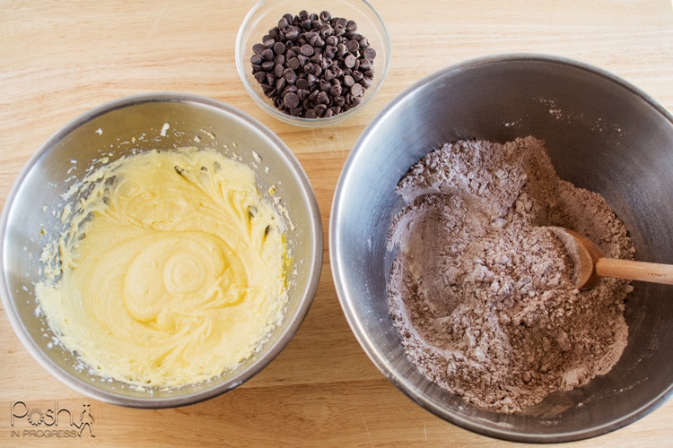 - Stir in flour mixture to form a stiff dough. I used my hands to integrate all the flour, since the dough is pretty dry. Mix in chocolate chips until combined.