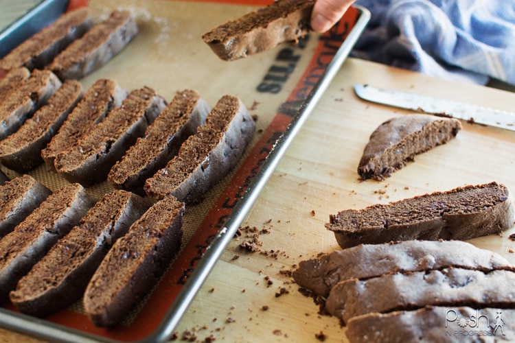 - Transfer to cutting board and cut diagonally into ¾-inch slices. Arrange biscotti, cut sides down, on baking sheet and bake for an additional 10 minutes, or until crisp. Cool on a rack.