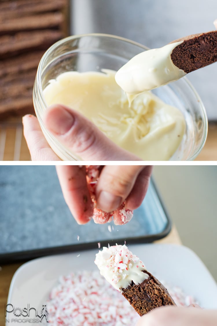 - Once cool, dip one end in melted chocolate and sprinkle with finely crushed peppermint. Let firm on a wax paper-lined baking sheet.
