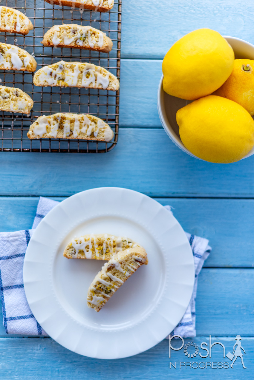 I added pistachios to this recipe for a couple of reasons. First, I think the texture works really well in biscotti. I also love the little flecks of green mixed in with the white frosting and yellow zest from the lemons.