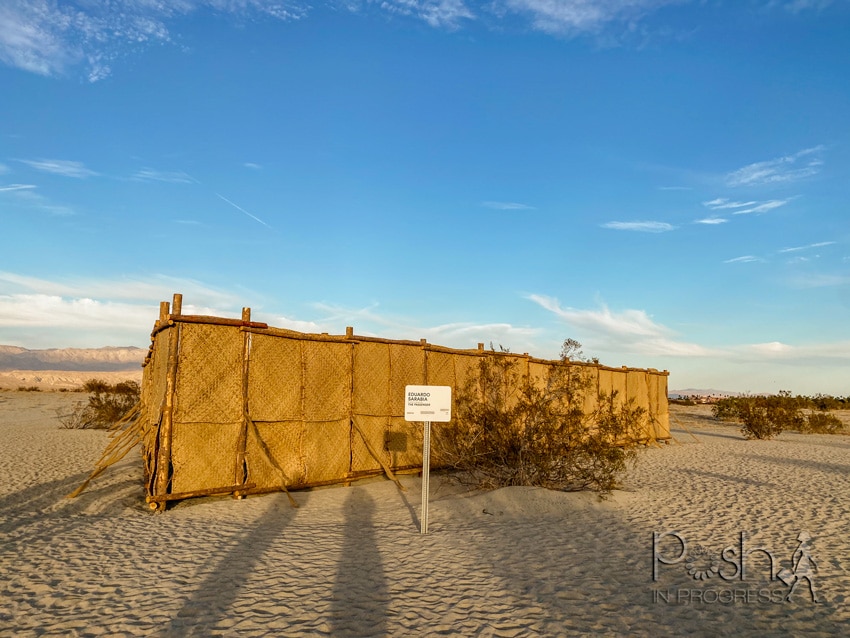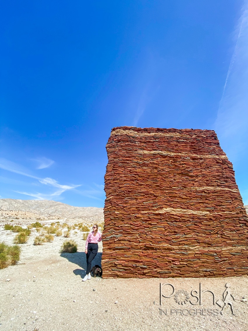 The one thing about Desert X that was rather difficult is that they are spaced all over the Coachella Valley. You have to drive to each individual installation. There’s also a lot of walking required to get to the various installations. The exhibition is definitely easier for able-bodied people. I am not sure someone with crutches or a wheelchair would be able to participate in some of the installations, especially those that were way out in the sand. I also think walking would be difficult for small children. We brought our Frenchies and they struggled a bit with the walking.