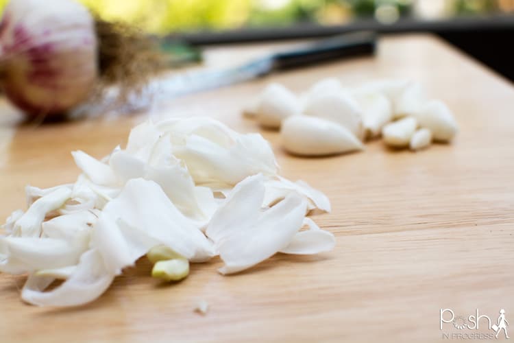 Peel the garlic and remove the membranes from the garlic cloves. Fill a medium sauce pan half full of water. Bring the water to a simmer. Once simmering, add the garlic membranes and let cook until the water returns to a simmer, about 5 minutes. Drain and let cool for 1 hour.
