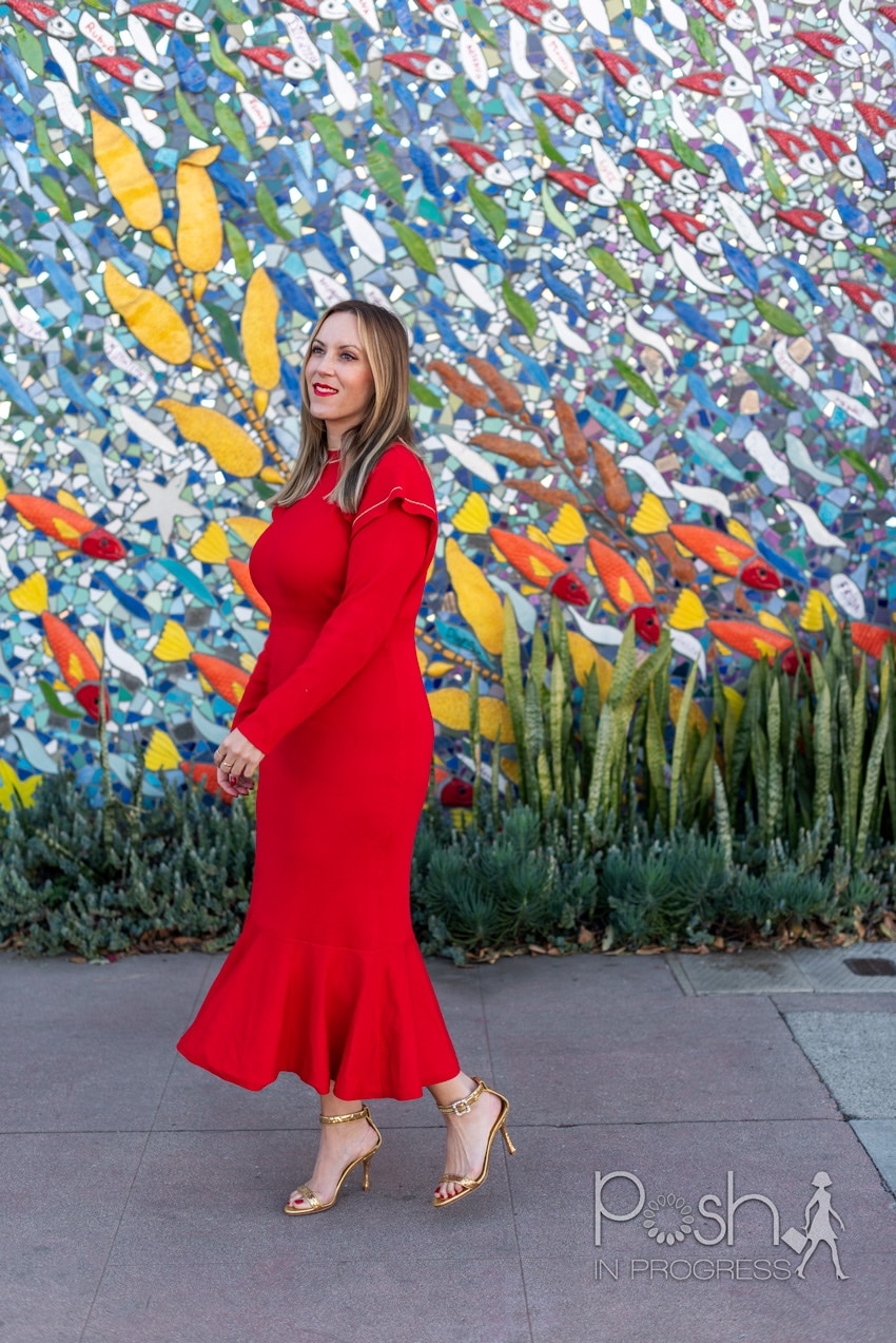 To make the whole look festive, I wore gold sequins shoes, and a bright red lip. Its hard to tell on the photos, but the dress is actually lined with some gold details around the neck and sleeves. It’s a fun little detail that makes the gold shoes a perfect choice. I also like to wear some statement gold earrings to go with the look. This dress would also look great with my hair up to show off the mock turtleneck and make room for the large gold earrings to shine.