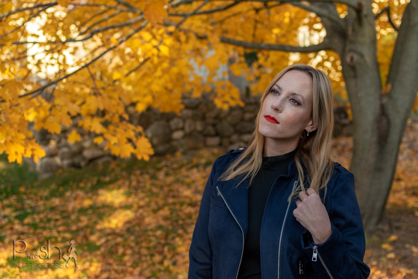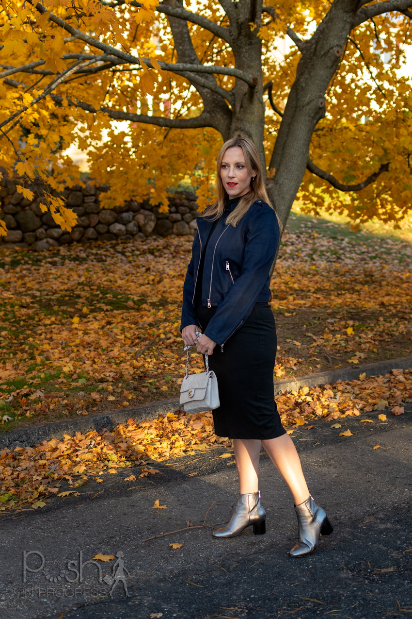 Until recently, I wasn’t a big fan of faux leathers and suedes. I guess, I’m more of a fan of the real thing. But when I saw this specific faux suede moto jacket, I really fell in love with the shape, the silver hardware against the dark navy, and I also love how soft it feels.