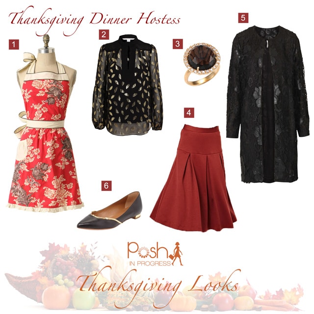 You decided to host Thanksgiving dinner, s your outfit and attitude will set the tone for the day. You want to be comfortable, but as the host, want to look elegant and confident. Choose a skirt that is stretchy, not restrictive, and has some movement. I chose a bold, saturated color that feels very fall and holiday. A patterned blouse with some shine pairs very well with the skirt. The blouse gives dimension to the look with metallic elements that always give a holiday vibe. Pointed toe flats elongate the leg but are comfortable to entertain your guests and stand in the kitchen all day. Tights with a seam in the back are a modern throwback to mid-century and go well with the midi-length skirt. This printed apron blends well with the other colors in the look while protecting your clothes during your last-minute kitchen runs. Right before dinner, you grab your cocktail ring that mimics the gold in the blouse and shoes that completes the look. Should you decide to leave the house after dinner to look at Christmas lights or partake in some other family festivities, you can pair this look with a lacey topcoat.