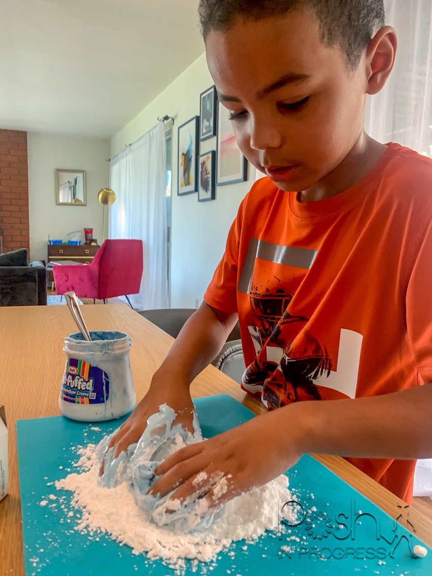In hindsight, I wish I had started the mixing process in a ziplock bag to keep it as clean as possible. However, my kids LOVED how messy they got and having to wash their hands several times to continue to combine the marshmallow fluff and powdered sugar.