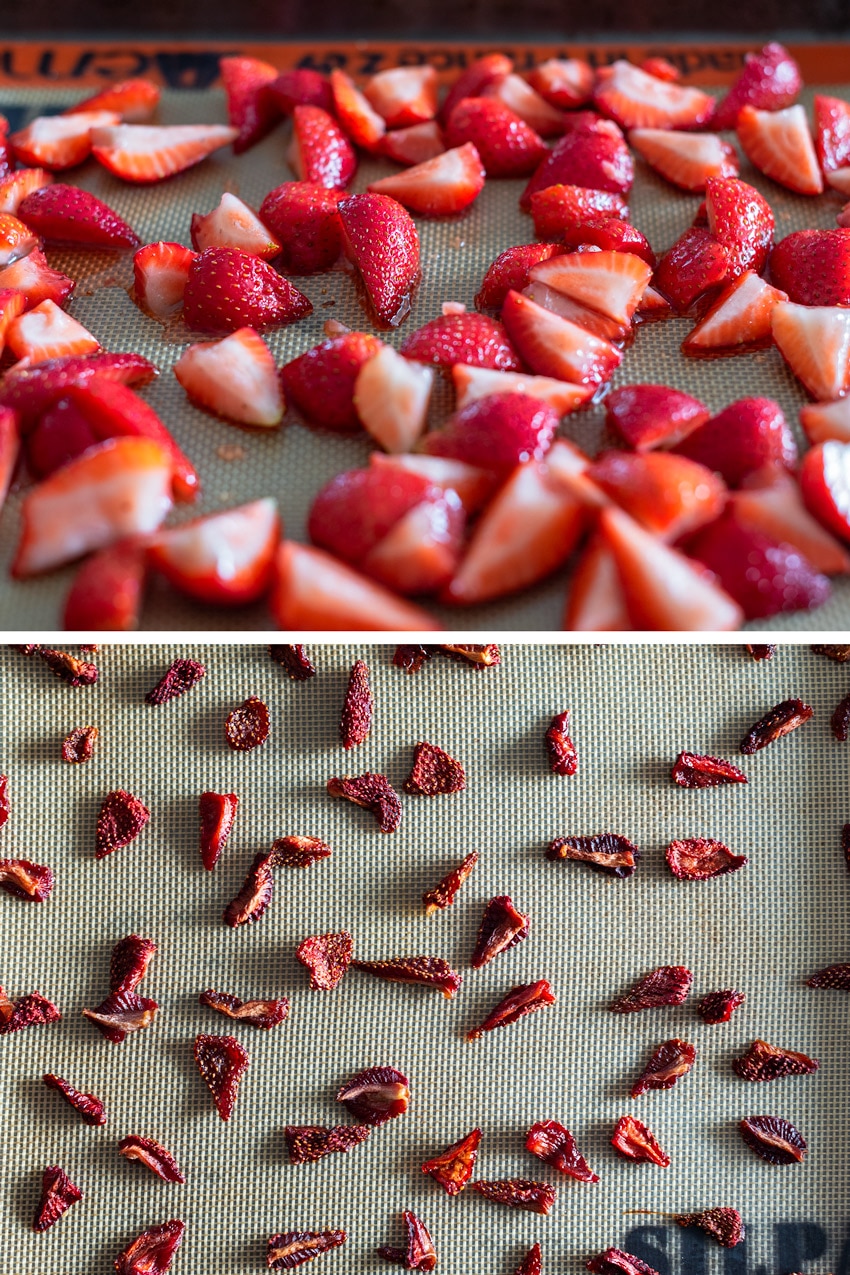 Preheat oven to 185° (or the lowest possible setting, which may be 200°). Spread out berries on a rimmed baking sheet lined with a nonstick baking mat and bake, rotating baking sheet about every 30 minutes, until berries are darkened in color and dried out around the edges but still slightly juicy in the center, 3–3½ hours. Let cool on baking sheet.