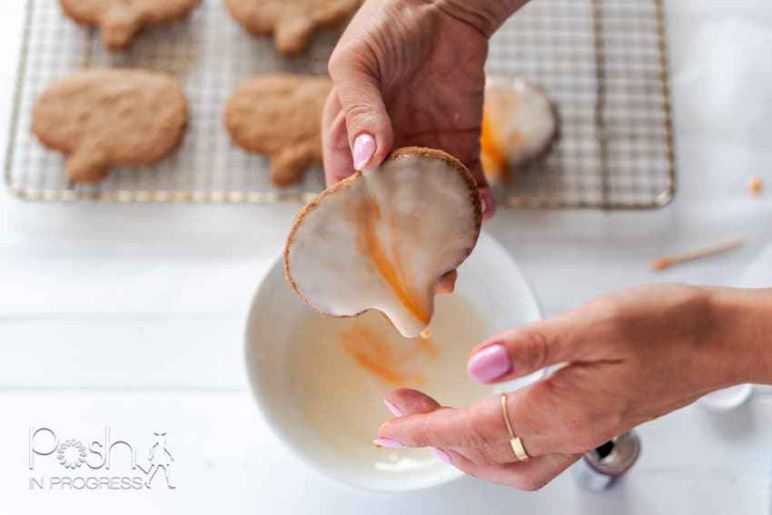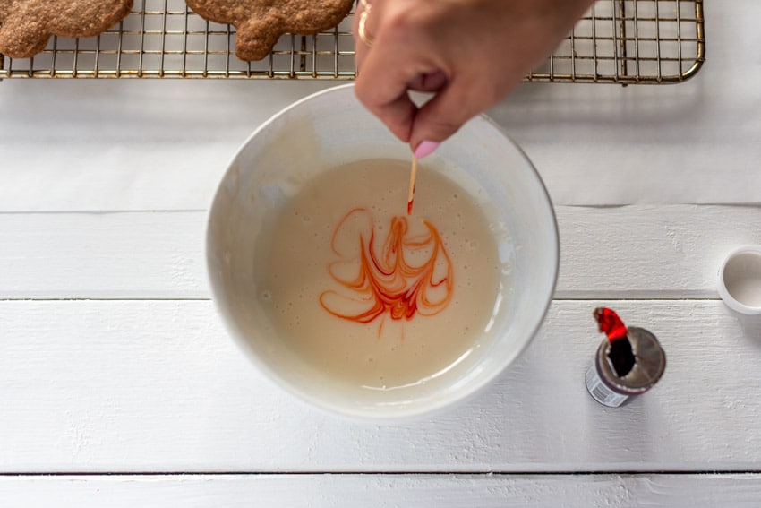 The process of glazing the cookies is actually super simple. Once you make the glaze, you simply dip a toothpick into the food coloring and then make little streaks in the glaze.