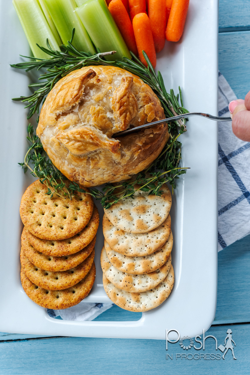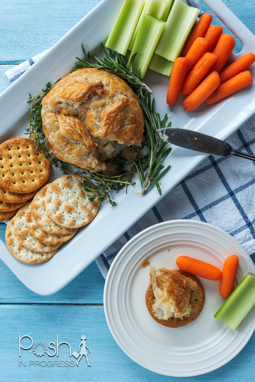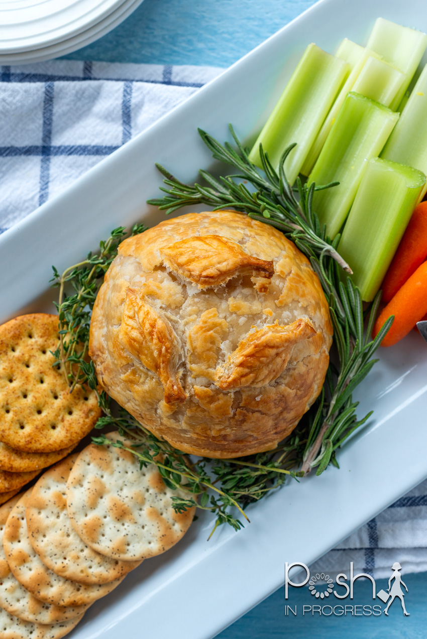 Bake for 20 -25 minutes, until golden brown. Serve warm on a platter surrounded by fresh rosemary and thyme and crackers and/or veggies.