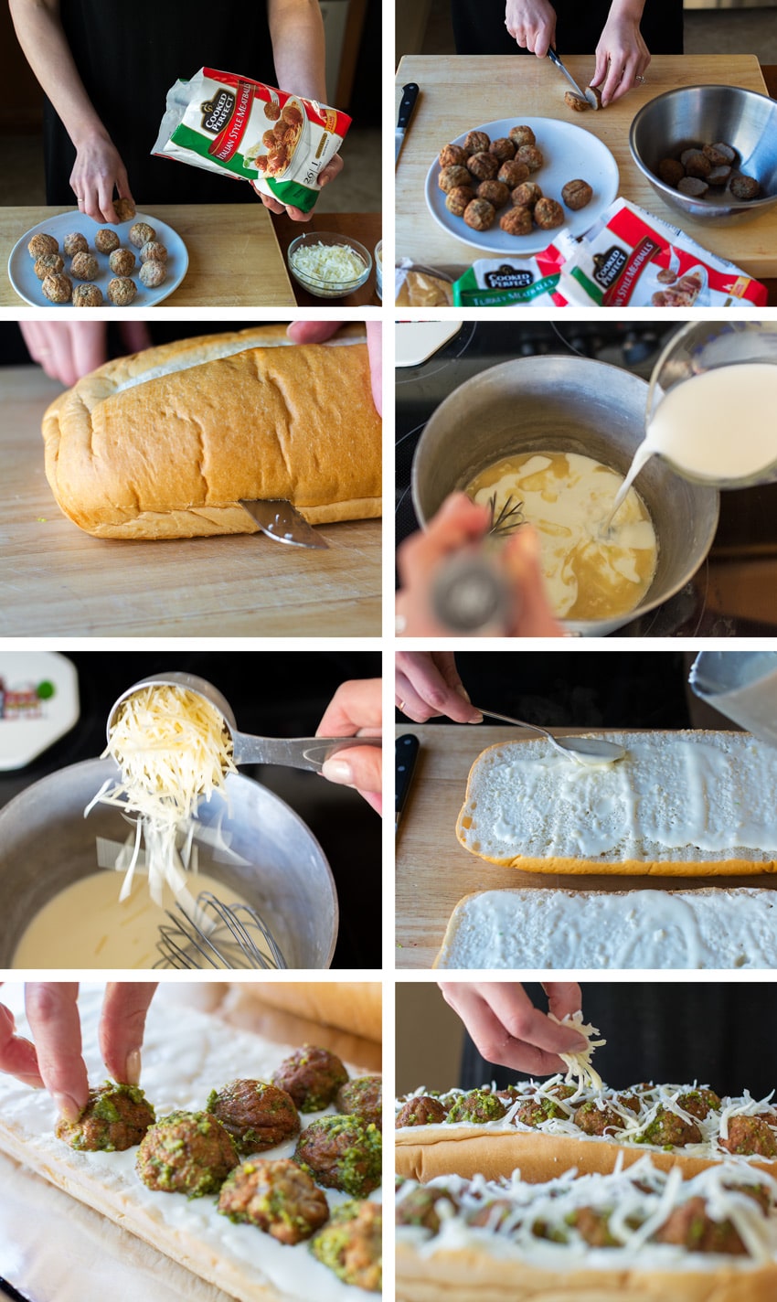 Preheat broiler. Cut the French bread lengthwise and add a generous layer of the cheese sauce to both cut sides. Add a layer of meatballs and top with mozzarella. Place under the broiler until bubbly and melty. Slice and serve!