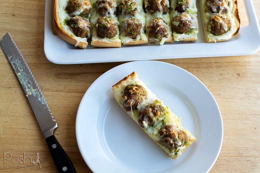 To make this meatball French bread pizza, I bought a nice loaf of French bread in the bakery section. Once I heated up the meatballs, I used pesto to coat the meatballs. If you don’t like pesto, you could also use marinara. Next, I made a simple parmesan cheese sauce and covered the bread with a thick layer. I topped each half of the bread with the pesto-covered meatballs and then topped them with a generous layer of mozzarella cheese. To heat it through, I broiled the two halves of the bread until the cheese was melted, bubbly and starting to brown.