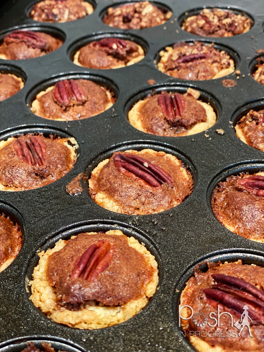Preheat oven to 350. In a stand mixer, mix together the brown sugar, melted butter, vanilla, and eggs until well incorporated. Next, add 1 tsp of chopped pecans into each of the prepared tarts and top with a spoonful of the tart filling, just to the top of the tart crust. You can add additional chopped pecans or a whole pecan on top, if you like.