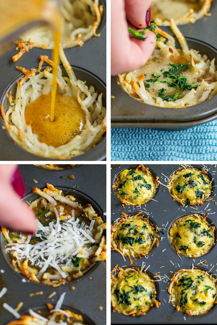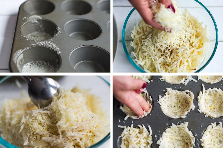 In a large bowl, combine the hash browns, ½ cup cheese, and salt + pepper. Divide the hash brown mixture evenly the muffin cups. Use your fingers to pack them tightly and shape them into nests or press down with a small measuring cup.