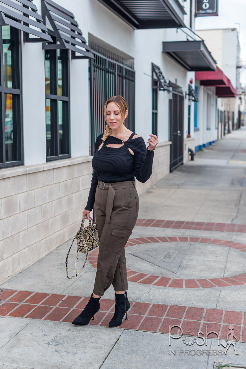 I recently got this cute cut out sweater and I think it’s such a fun change of pace for winter fashion. I generally avoid bulky sweaters in the winter and I love that this one is streamlined and unique. It also has a cute feminine touch with the little pearl button detail. I’ve noticed so many different styles of cut out sweaters, off the shoulder sweaters and I think all of them add so much visual interest to a look. Read on to learn more about cut out sweaters, how to style them and also why you should also try cargo pants this year.