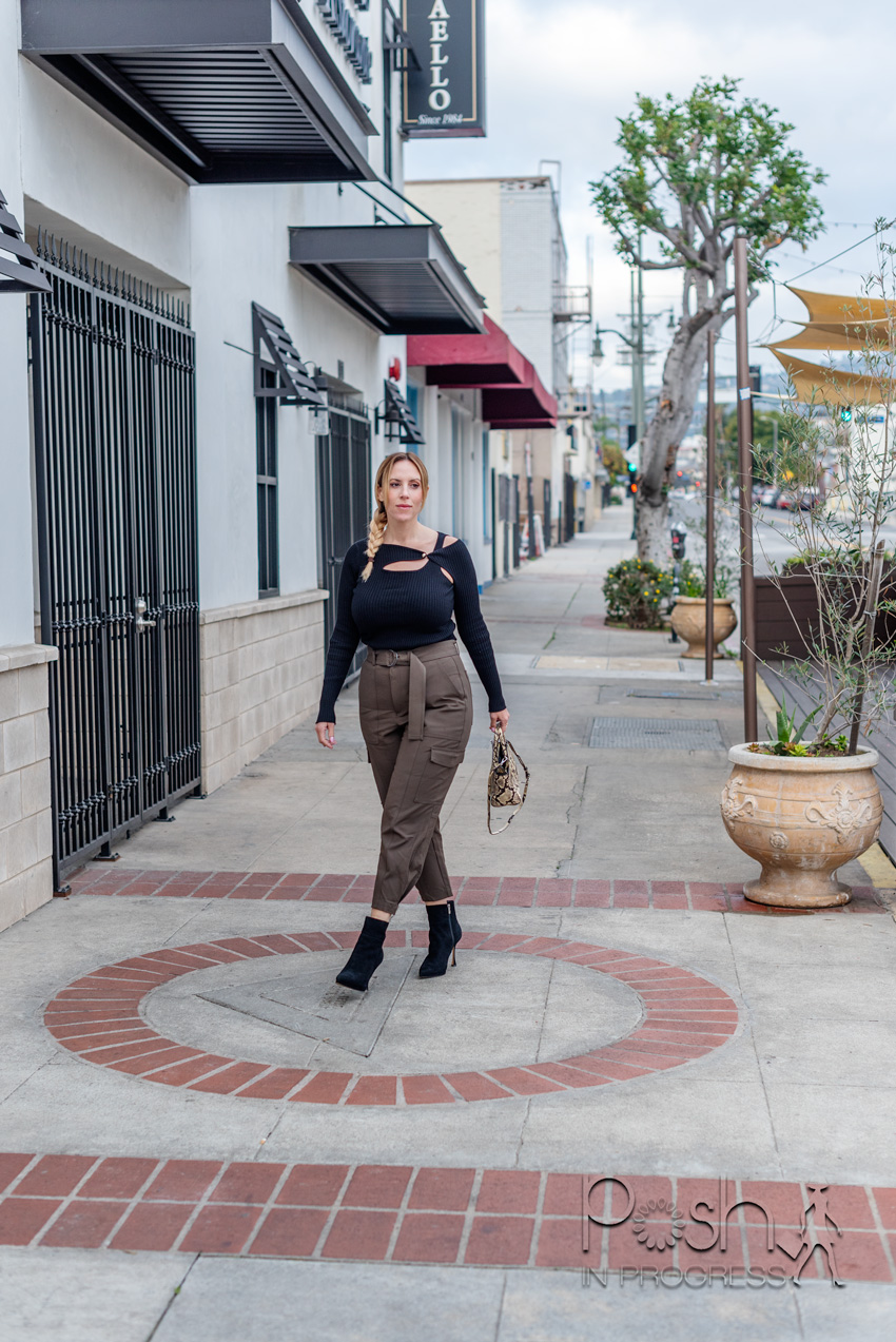 Remember to keep the rest of your outfit simple and let the sweater be the focal point. For my outfit, I chose to style my sweater with cargo pants and a simple pair of black booties. Although cargo pants are visually interesting, this pair is pretty classic. It doesn’t compete with the sweater but compliments it. I liked the thought of cargo pants with this sweater because it’s a nice mix of feminine and masculine. For the bag, I went with a bit of an animal print to add a bit more visual interest to the otherwise neutral color palette.