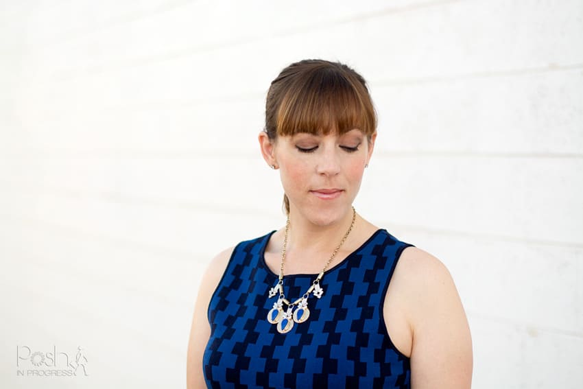 I chose to style the dress with bright patterned shoes in a similar checked pattern. I also threw on a statement necklace with blue stones and carried a vibrant red clutch. You might think the choice of shoes and purse are a bit odd. However, I thought the dress needed some bright colors, especially in the summer time.
