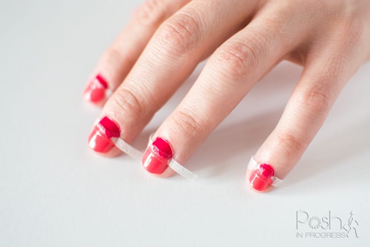 - Apply one strip directly above the natural half moon shape on your nail bed and press to ensure all the air bubbles are out of the tape for a secure seal.