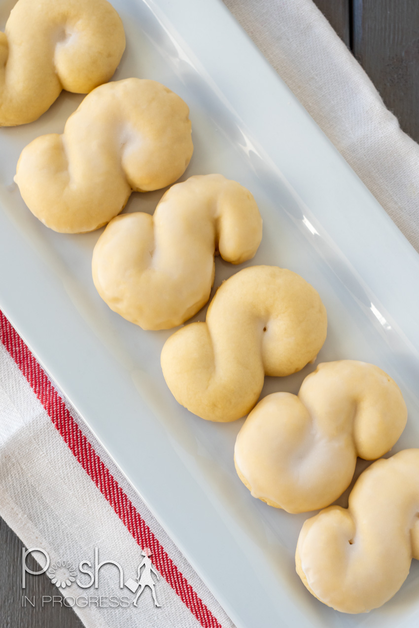 The only slightly challenging part about making Sicilian S cookies is getting them into the S shape. I personally enjoyed the process. Just like when I was a kid playing with play dough, I rolled out the dough into snake shapes and then bent them to make the S shape. I also added a thick glaze onto mine. I actually dipped them twice to make it a bit thicker. Some people use the non-pareils for color and texture, just like a lot of Italian cookies have on them.