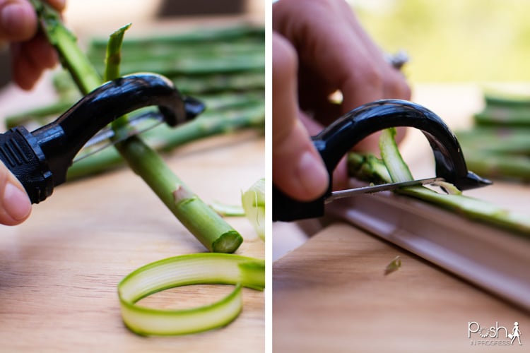 Using a vegetable peeler, thinly slice the asparagus lengthwise into strips and place in a large bowl. (If you have trouble peeling the final portion of an asparagus spear, prop the spear up on the flat handle of a spatula or spoon. This will raise it just high enough to allow the peeler to move freely.)