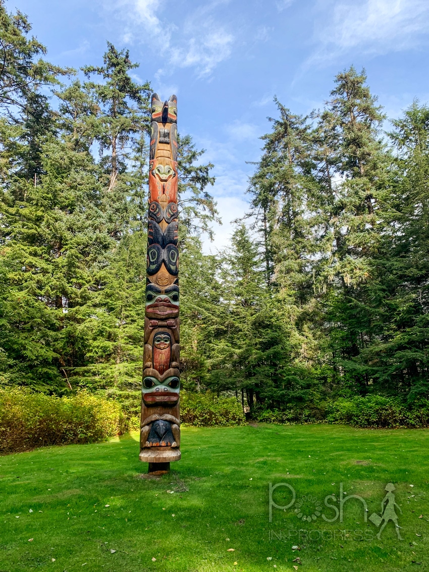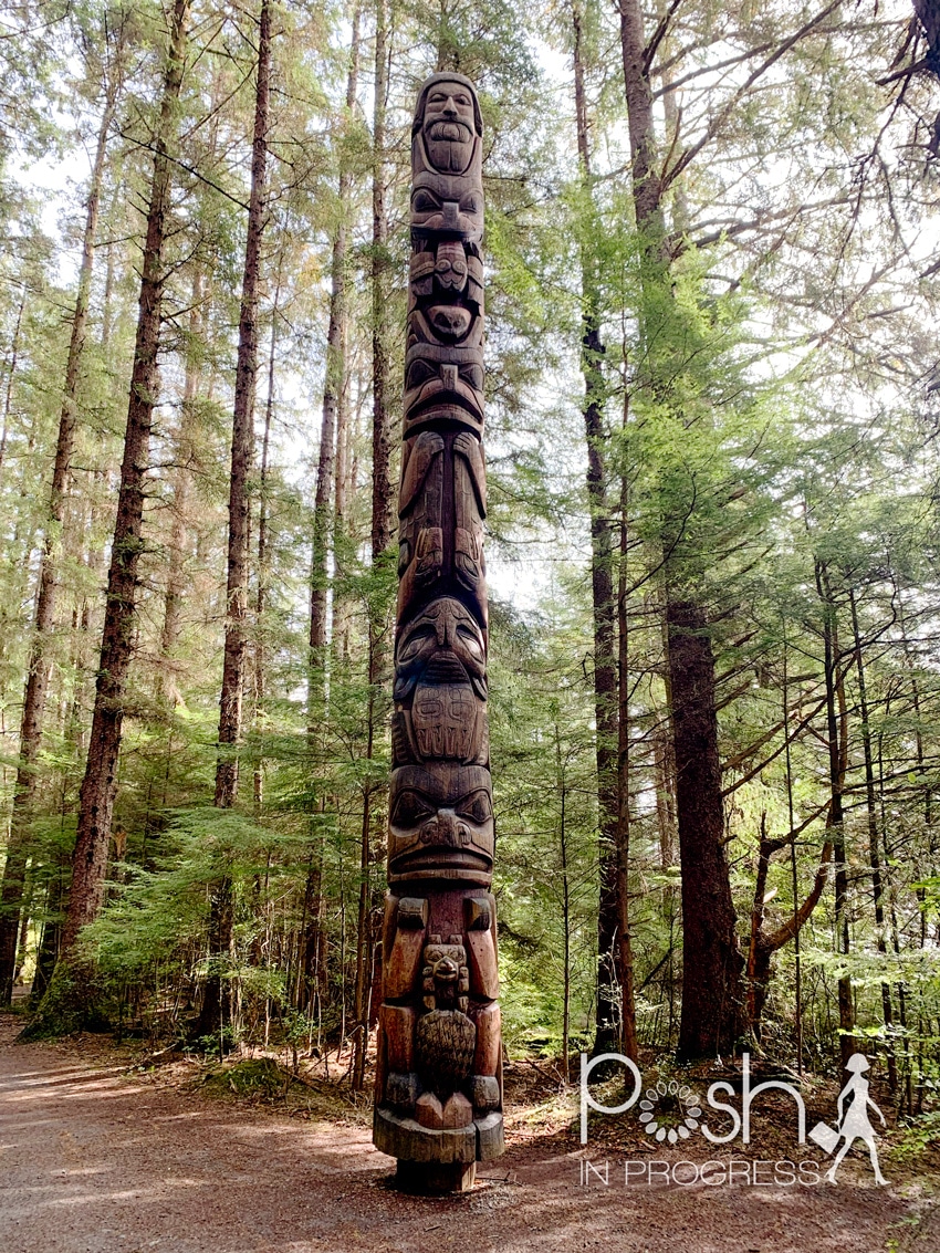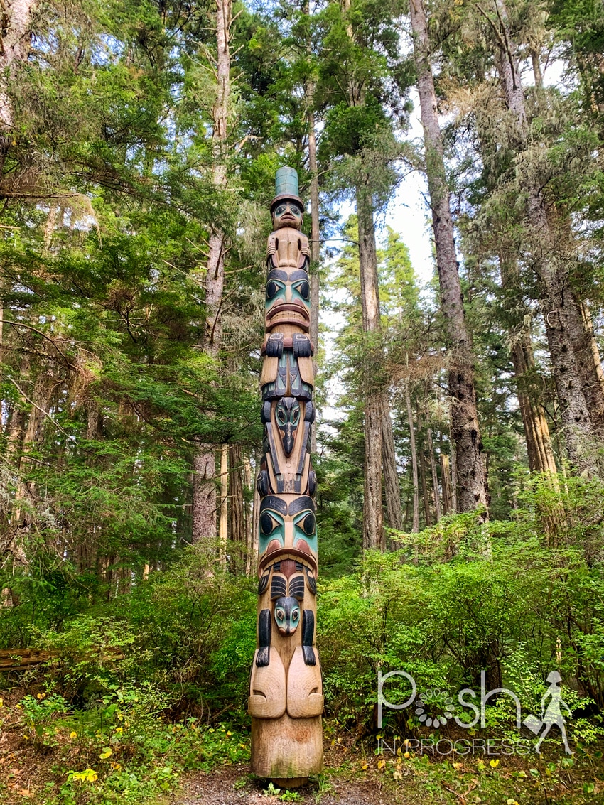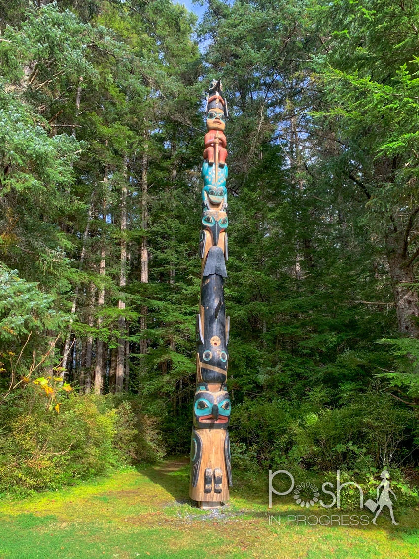 We actually visited Sitka National Historical Park two different times because there are a lot of different totem poles to see and the walking trails are really beautiful. We were lucky enough to see an indigenous man working on carving a new totem pole. He told us he had already been working on it for a couple of months. It was fascinating to see all of the effort required in carving one of those totem poles. The level of detail is truly amazing.