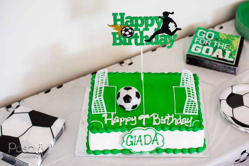 I wasn’t sure what I wanted to do for the cake. My favorite cake shop does printable images and also more elaborate fondant cakes. I decided to keep it pretty simple by choosing a soccer field. Then, I bought these goals and ball set along with this cake topper and these candles. They also added a cute plaque with her name on the front of the cake. It was a pretty simple design and I think I could have actually done it myself. But, this is another example of a time-saver. I prefer to spend the $60+ on a custom cake than to make it myself because there are so many things that could go wrong if I made it myself.