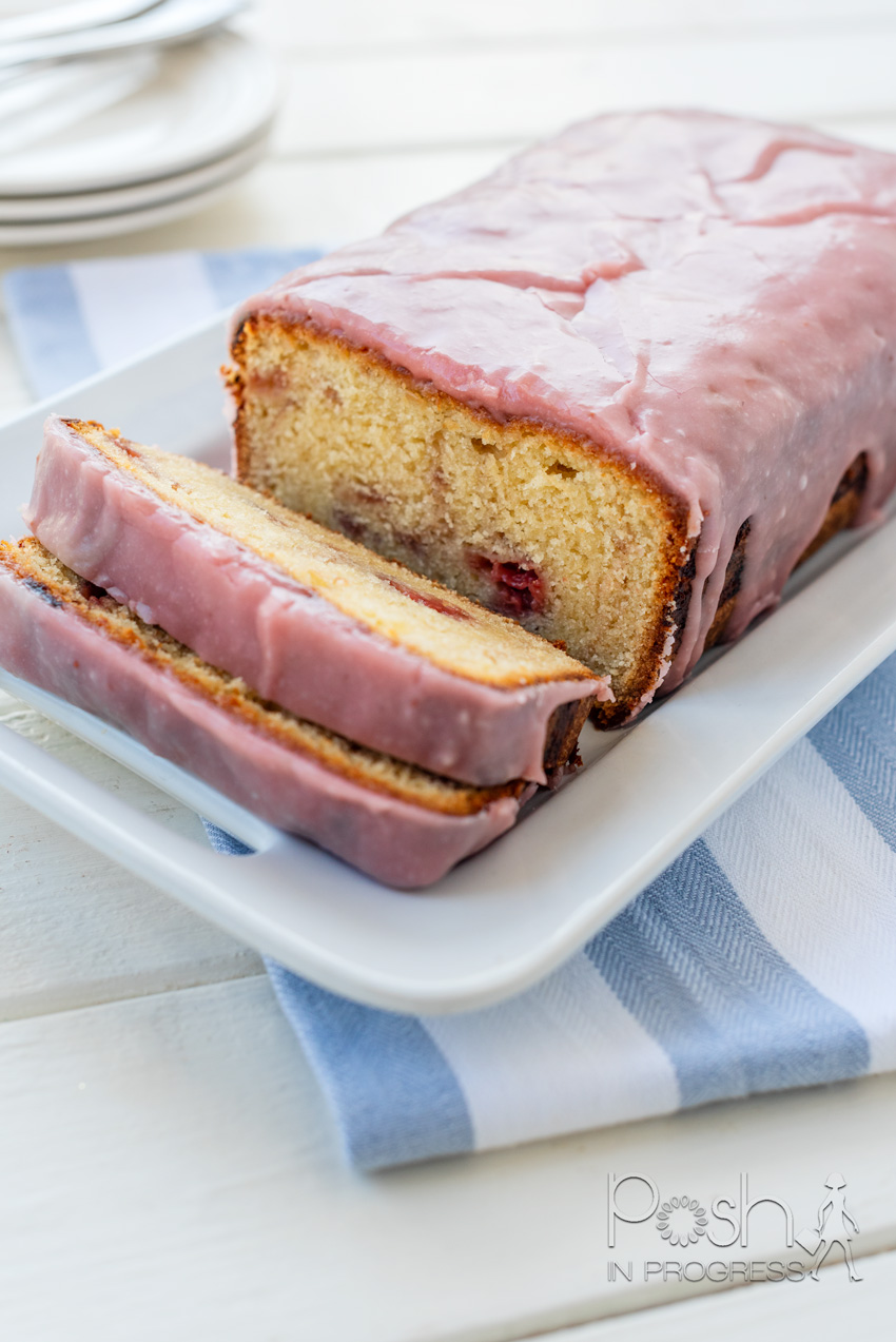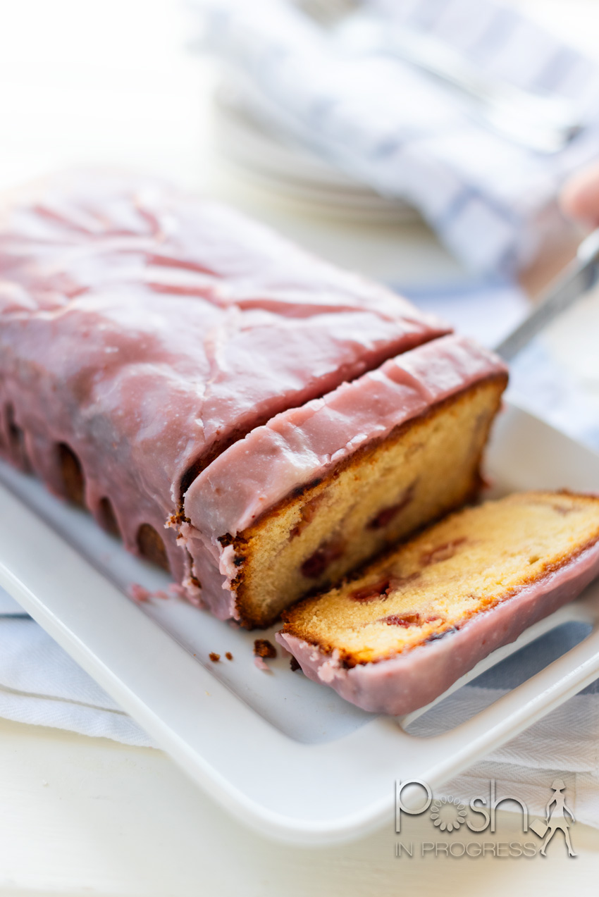 For the glaze: Combine the butter and jam in a small saucepan and melt over low heat, stirring until smooth. Whisk in the cream cheese until smooth, then whisk in the powdered sugar to make a smooth, thick glaze. Whisk in the food coloring, if desired. I used 1 drop of red food coloring to make it a bit brighter. Drizzle the glaze over the cooled cake and let set at room temperature, for at least 1 hour.