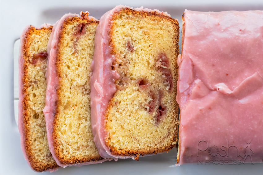 The recipe I’m sharing below is a strawberry pound cake with strawberry glaze. My son didn’t like the glaze because it has a bit of a sour taste due to the inclusion of cream cheese. My daughter and I loved the combination of sweet and tangy that this dessert provides. If you don’t like a sour note in your desserts (i.e. not a cheese cake fan), then you might want to make a strawberry pound cake with glaze made out of powdered sugar or buttercream, but leave out the cream cheese.