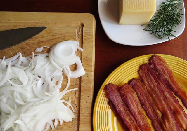 Reserve 2 tablespoons of the bacon fat in the pan and reduce the heat to medium. Add the onions, salt, pepper, and rosemary. Cook over medium heat until the onions have softened, stirring frequently, about 15 minutes. Do not let the onions brown.
