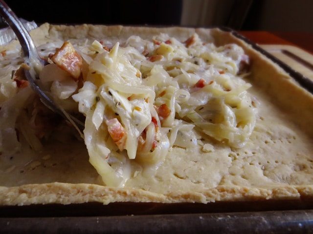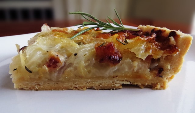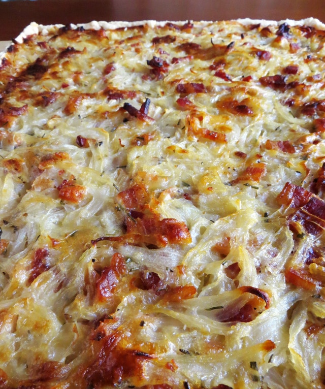 Remove the paper and weights and bake another 20 minutes to brown the bottom. Allow to cool slightly before filling. Reduce the oven temperature to 350 degrees. Fill the pastry crust with the onion mixture and bake until golden brown and the filling is set, about 45 minutes. Oven times will vary, as this last step took over an hour for mine to brown nicely.