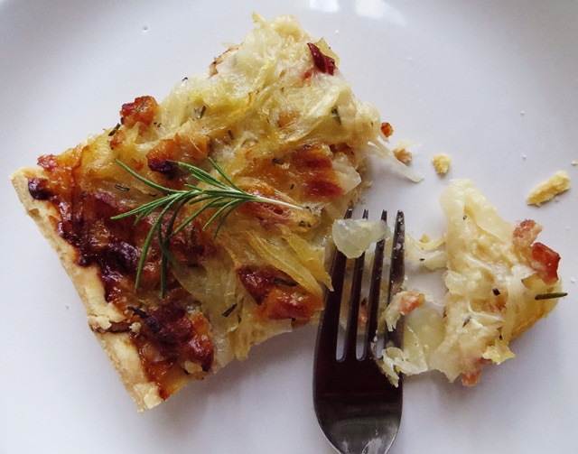 The original recipe called for half the bacon and none of the cheese I used. I decided to up the bacon quantity and add the cheese to help balance the sweetness of the tart crust and the onions. I’m sure glad I did! It was still on the sweeter side, but the smokiness of the bacon and saltiness of the cheese added a nice dimension.