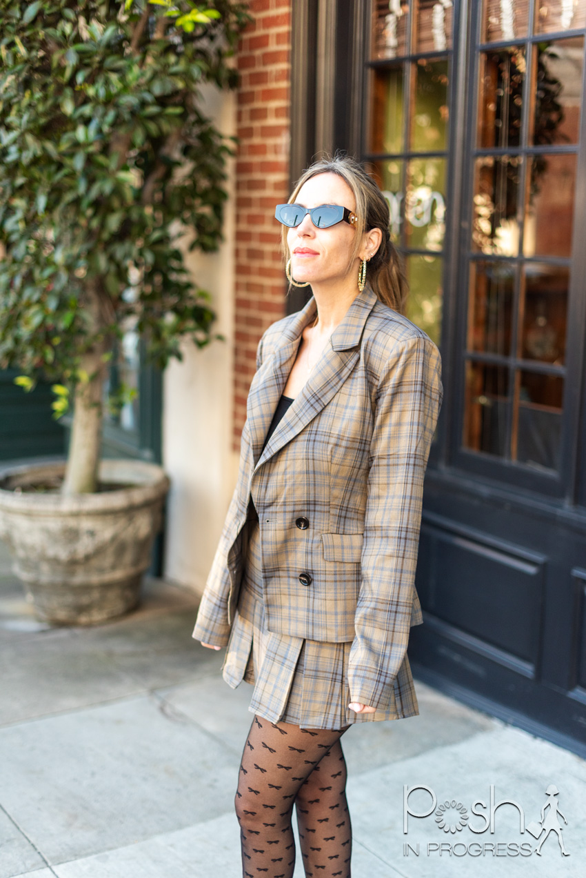 Let’s talk about the short plaid skirt. This piece is trending hard, but it needs thoughtful styling to feel elevated. When styled intentionally, a short plaid skirt as part of a plaid suit feels chic, not juvenile. Here’s how to elevate it: