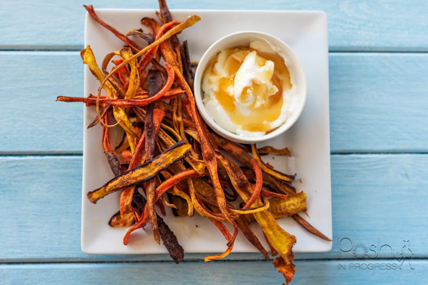 The carrot chips turned out great. I loved the cinnamon and ginger against the sweetness of the carrots. Next time, I might try adding just a bit of sugar for an extra sweet veggie snack. However, if you like Greek yogurt with honey, it does make the perfect dipping sauce for the carrots.