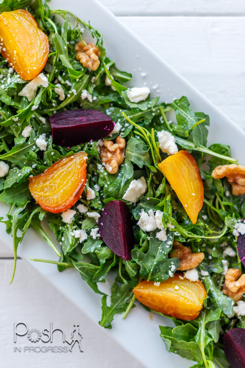 When you are ready to serve, place the arugula in a bowl and add 3-4 tablespoons of dressing and toss to coat. Add more dressing, as desired. Arrange the arugula on a plate and top with beets, feta, and walnuts. Serve immediately. Enjoy!