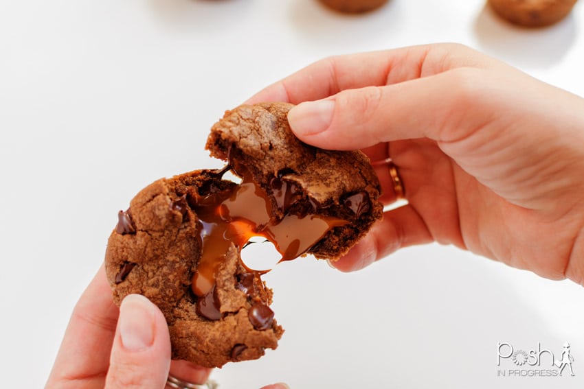 In a separate bowl, combine the flour, cocoa powder, baking soda, and salt. Add the half of the flour mixture to the butter mixture and mix until incorporated. Add the rest of the flour mixture to combine. The dough should be thick and sticky. If it is too sticky, where it sticks to your hands, then add a bit more flour. (You should be able to pick up the dough and mold it into a ball without it sticking to your hands.)