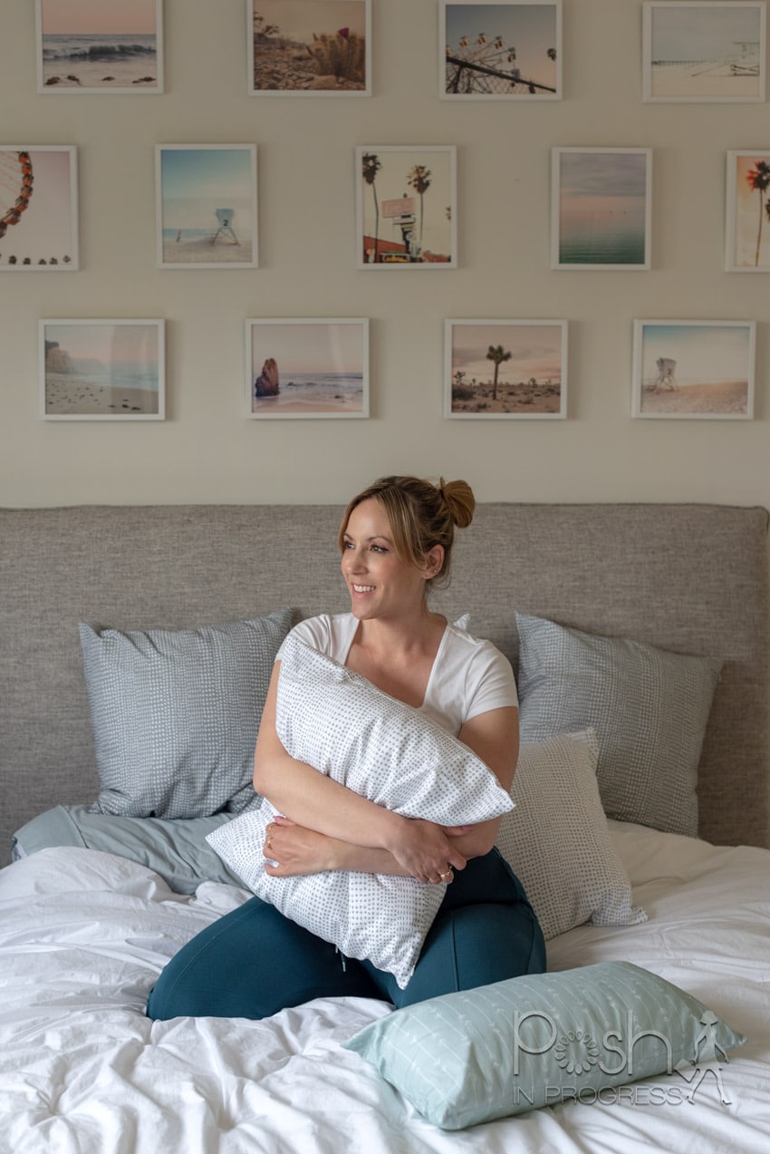 My last bedroom was dark. I used dark colors, like reds and burgundies. I do love rich jewel tones, but this time around, I wanted my bedroom to feel serene. If I’m honest, juggling work, mom life, and my blogging business can be quite stressful. So, it was important to me to create a space that was truly calming and I think I did it!I reached out to my friends at Minted to see if they would be wiling to work with me to create the perfect bedroom gallery wall. They agreed to provide the prints. While I was searching for the art, I also realized they sell pillows and lamp shades too! I also worked with Interior Define to create my gorgeous headboard and Allswell to get the perfect mattress.