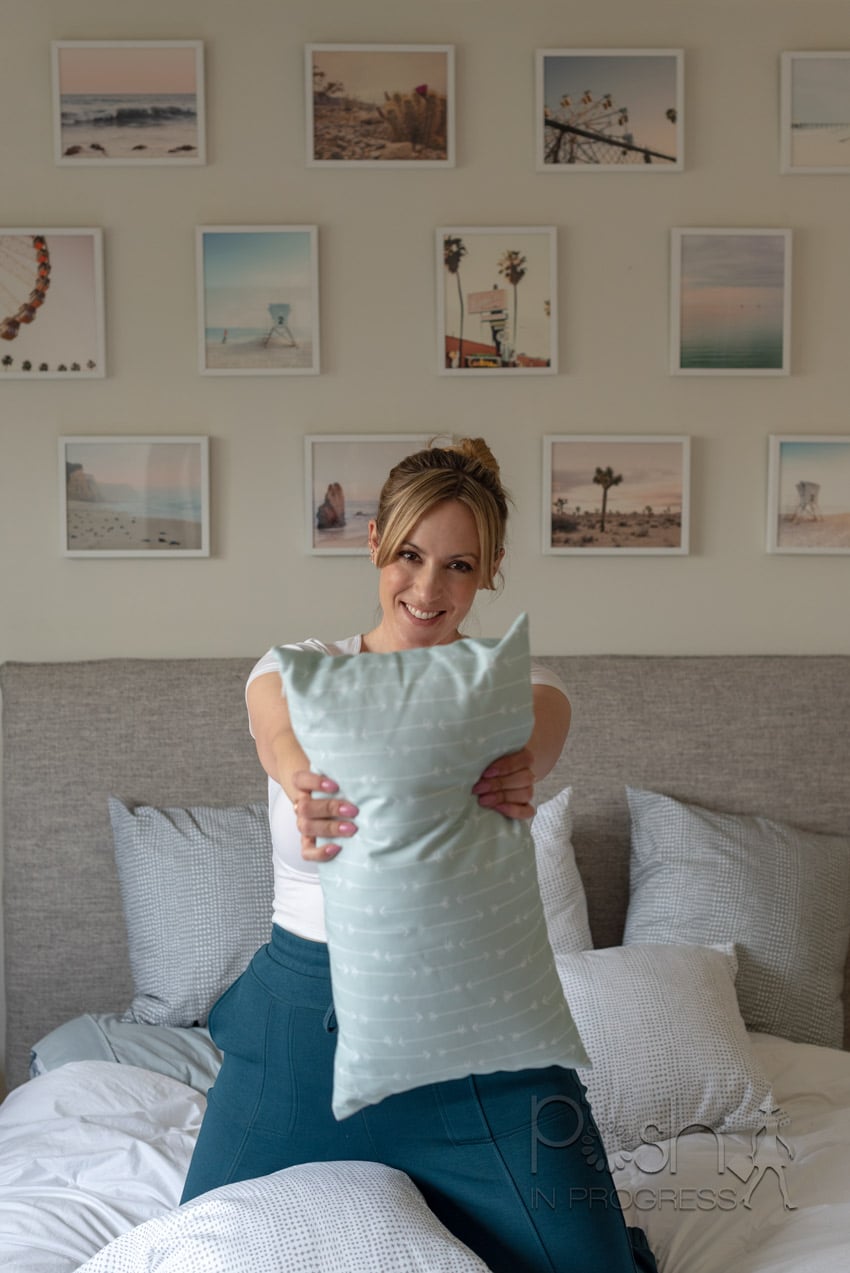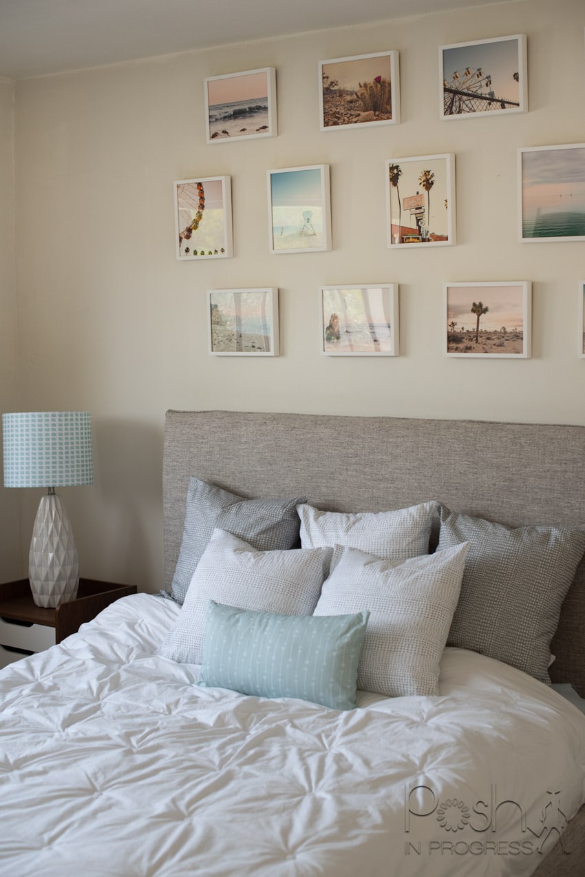 As for selecting the pillows and the lamp shade, I let the photos decide. Once I realized I had a lot of light blues, I chose a couple accent pieces to bring out those blue hues. I also opted for grey and white pillows to blend in with the bed and keep the whole space ultra light and airy. I’m such a big fan of the Minted pillows because they have a zipper so you can wash the pillow cases at any time. That is such a nice feature that I think so many pillows are often missing.