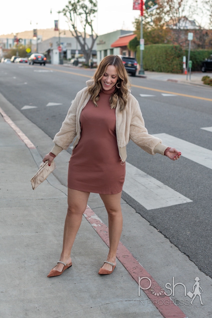 I linked to a similar pair since mine are now sold out. For your convenience, I linked to two different pairs – one that looks just like them but has quite a high price point. I also linked to a more affordable option that still looks quite similar. For the look I’m featuring here, I chose to go for a monochromatic look with the flats matching my turtleneck dress (my dress is only $20!). I also topped the look with a faux fur jacket which is also under $20. My entire look is just slightly over $100. For me, the best part of the look is how versatile it is. The jacket and flats go with so many different things.