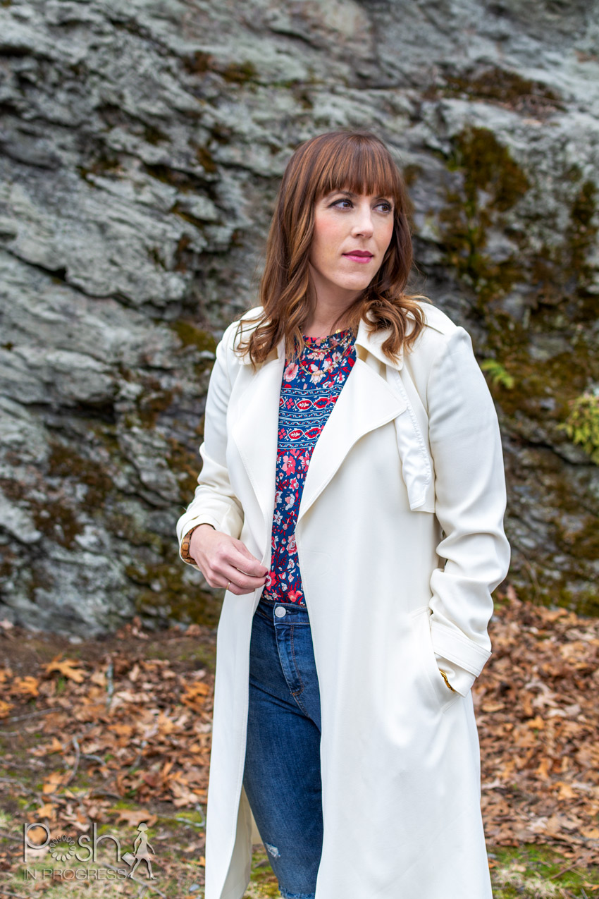 The first piece I tried on was this gorgeous theory trench coat(on sale!). At first, I was a little unsure. First, although I love ivory against my skin, I normally wouldn’t get such a pricey jacket in such a striking color – mostly because I’m a busy mom who’d fear constant dry cleaning bills. Second, I was ultra confused about how this piece would work in my daily life.