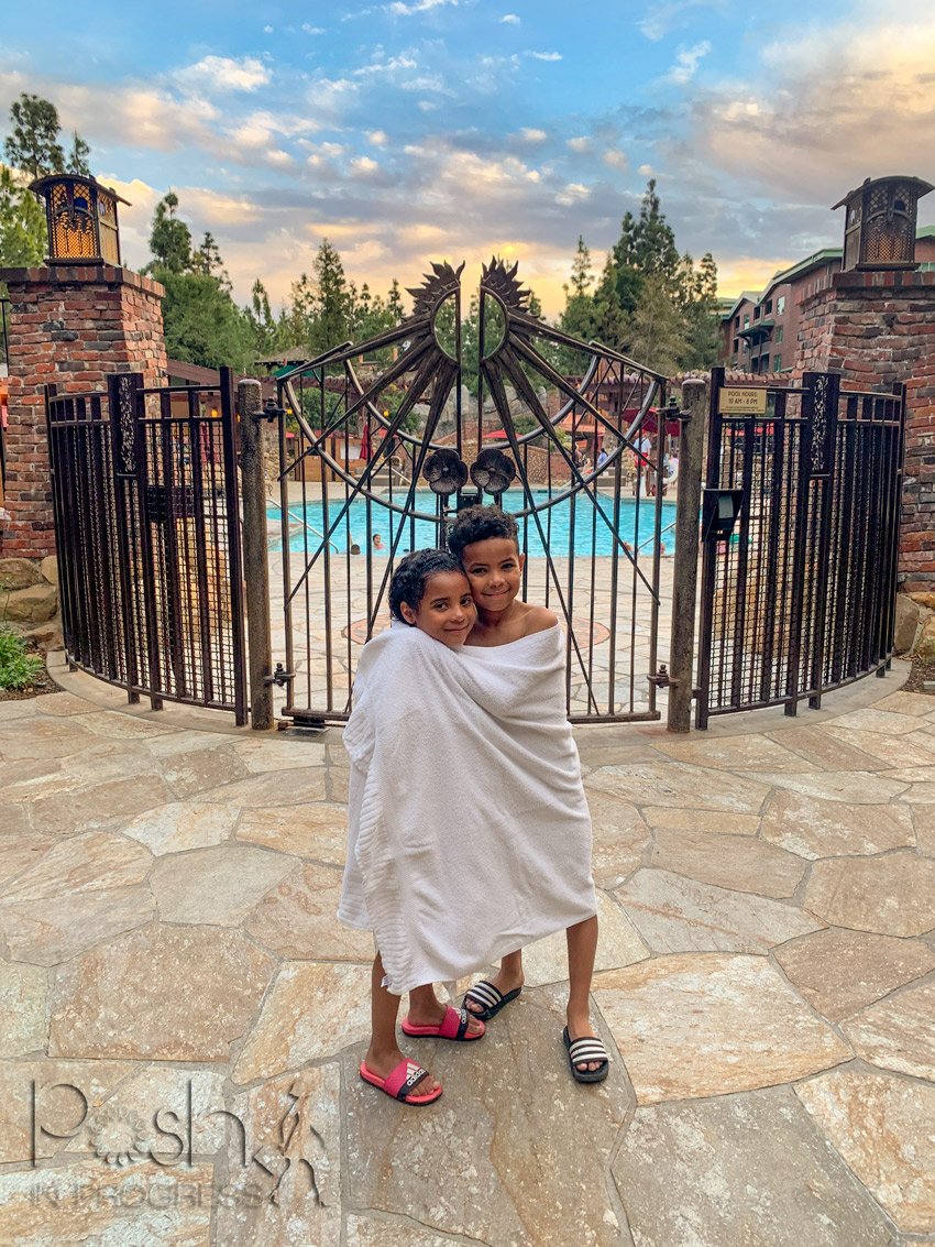 We got back to the room to change and we were welcomed with a whole bunch of yummy Disney-themed desserts. We had Mickey-shaped macarons and chocolate-dipped mickey-shaped brownies. My kids were beyond thrilled. Who doesn’t like a sweet treat in the middle of the day, right before heading to the pool. I made sure to remind my kids just how lucky they were that we were guests of Disneyland.