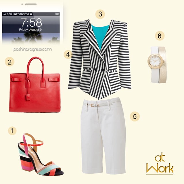 For the work look, I chose knee-length crisp white Bermuda shorts, which are both work-appropriate (unless you work in only the most conservative environments) and provide the leg coverage many women crave. I paired them with a striped blazer for a bit of edge, and a bright blouse for a pop of color underneath. The semi-wedges I chose play up the stripes in the blazer but add some visual interest to showcase your lower legs.