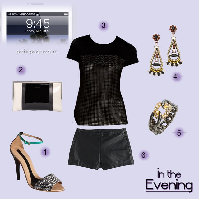 The evening outfit is all about an edgier rocker look. Leather shorts are everywhere, with many in bolder colors. For evening, I prefer a darker color pallet, and I like the versatility of black leather shorts, as they could be worn for many different occasions. If you are going to invest in something like leather shorts (or anything leather for that matter), choosing a more neutral color will ensure you can get more wears out of the item. I chose these shorts because of their simple shape, just-right inseam length and rich leather. I paired the shorts with a perforated faux leather top and sky-high heels with a bit of graphic interest. Nothing showcases a women’s legs better than stilettos. In this case, they just might be worth the pain.